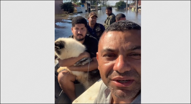 O GCM Leandro está no Rio Grande do Sul ajudando no resgate de animais desabrigados por conta das chuvas. Ele conseguiu alugar um barco e está com voluntários em busca dos bichinhos.