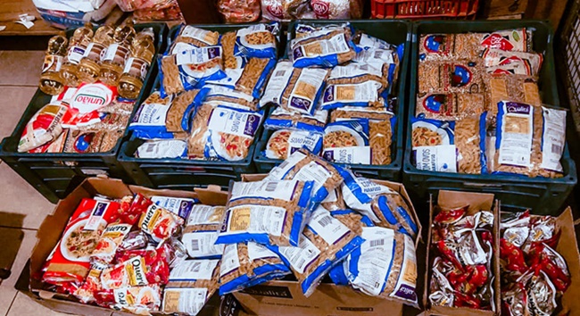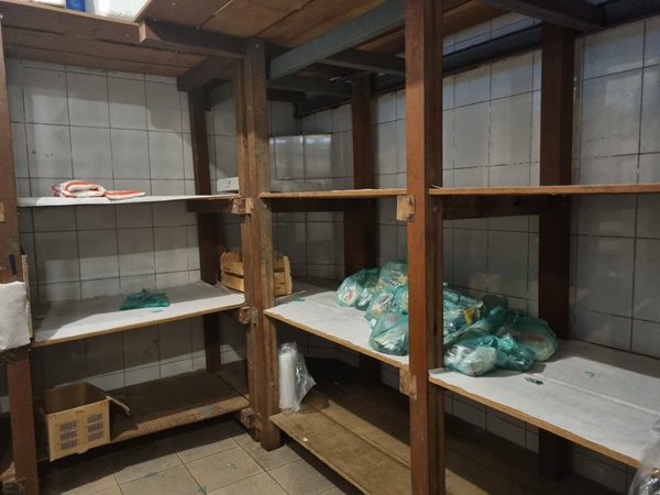 No trabalho da Anuepo são distribuídas sacolas contendo 5kg de alimentos não perecíveis, 1kg de pão e, quando disponíveis, verduras, frutas e legumes (estoque de alimentos está muito baixo, quase vazio, como mostra a foto).