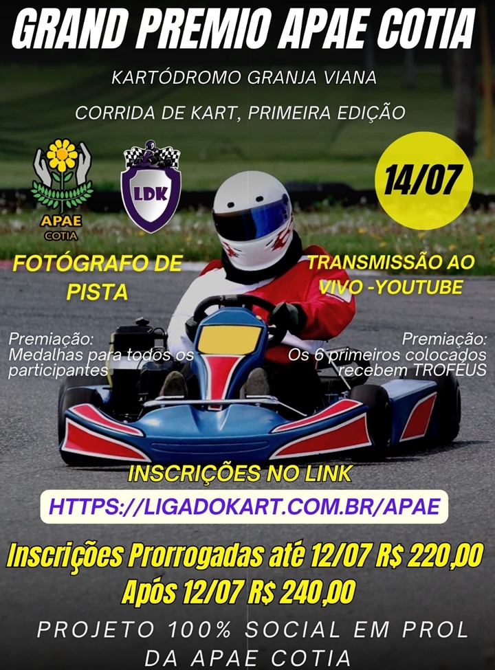 Inscrições pelo link https://ligadokart.com.br/apae/