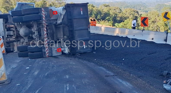 Nesta segunda-feira (14), um caminhão carregado de massa asfáltica tombou no km 49,2 da Raposo Tavares, em São Roque.