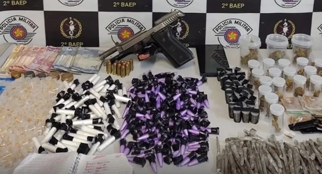 Um homem foi preso em flagrante por tráfico de drogas, receptação e posse irregular de arma de fogo de uso restrito em Santos. A pistola foi furtada em 2019, de um policial civil em Embu das Artes.