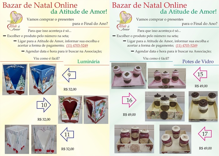 Mais uma ação da Associação Espírita Atitude de Amor visando manter seus trabalhos assistenciais. Começou o Bazar de Natal Online, onde você pode escolher produtos pela internet, ligar no telefone da associação e encomendar. A retirada é na sede, na Rua da Prata, 224, no Jardim Nomura, com agendamento prévio.