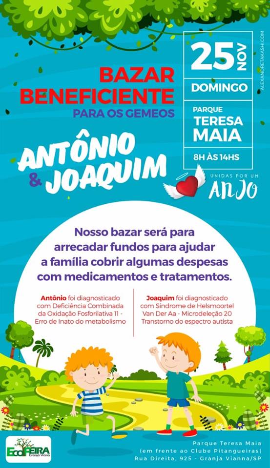 No dia 25 de novembro acontece na Granja Viana um bazar beneficente em prol dos gêmeos Antônio e Joaquim, que tem doenças raras.