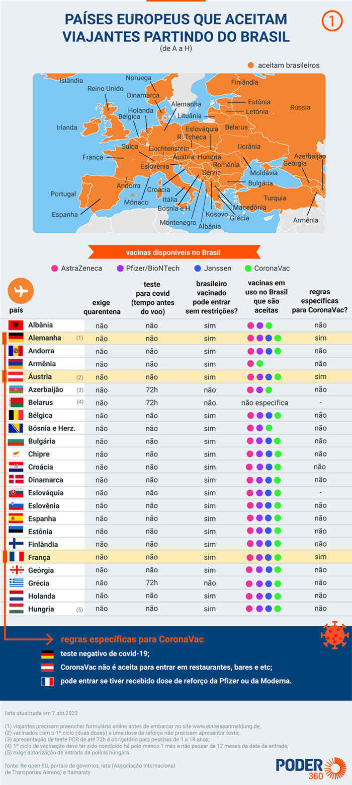 Outras cinco nações da Europa permitem a entrada de brasileiros, mas ainda adotam como pré-requisitos testes PCR com resultado negativo e/ou quarentena. São eles: Azerbaijão, Belarus, Grécia, Rússia e Sérvia. Já Bélgica, Eslováquia e Turquia relaxaram as restrições e permitiram a entrada de brasileiros somente com a apresentação do comprovante de vacina.