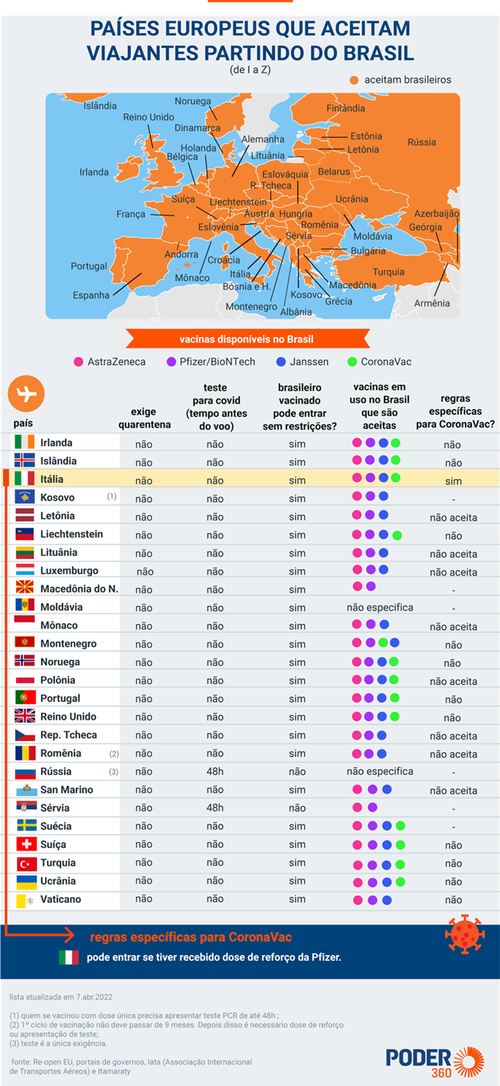 Pelo menos 43 países da Europa aceitam a entrada de brasileiros completamente vacinados contra o coronavírus sem restrições, como a apresentação de teste negativo para a doença ou a necessidade de realizar quarentena.