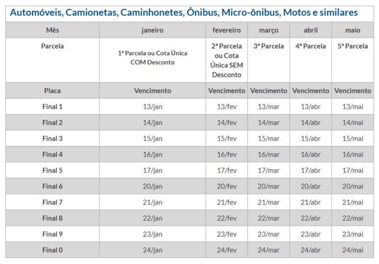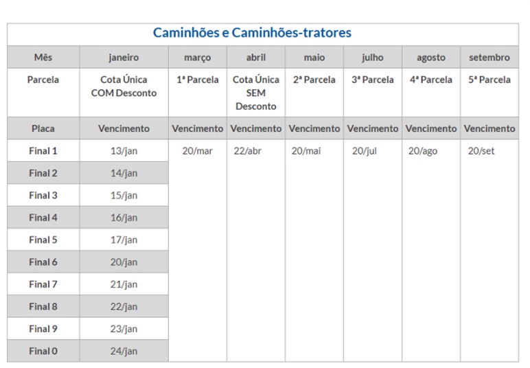 Os caminhões têm prazos diferenciados: para o pagamento integral antecipado em janeiro, é concedido desconto de 3% – o calendário começa em 13 de janeiro e segue até o dia 24, conforme as tabelas abaixo. O vencimento em cota única, sem desconto, é 22 de abril. Para os proprietários que optarem pelo parcelamento em três, quatro ou cinco vezes, sem desconto, os vencimentos são em 20 de março, 20 de maio, 20 de julho, 20 de agosto e 20 de setembro.