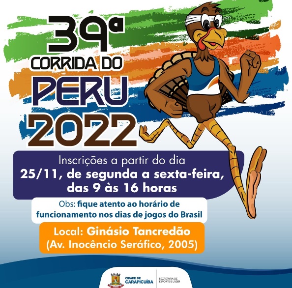 No dia 18 de dezembro, Carapicuíba vai realizar a 39ª edição da tradicional Corrida do Peru. As inscrições já podem ser feitas no Ginásio Tancredão, de segunda a sexta, das 9 às 16 horas, com exceção dos dias de jogos da seleção brasileira na Copa do Mundo, na qual o horário de expediente da prefeitura será diferente.