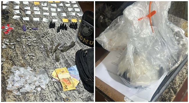 A equipe realizou uma perseguição e conseguiu localizar o bandido. Em busca pessoal, foram localizadas em sua posse diversas porções de drogas acondicionadas de forma típica para comercialização.