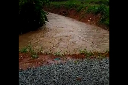 Nas imagens, o córrego está quase invadindo a estrada, devido ao excesso de chuvas. Moradores reclamam da falta de manutenção na estrada e de desassoreamento no córrego.