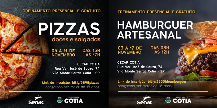 Para se inscrever basta acessar os links abaixo e preencher o formulário do curso desejado. As aulas acontecerão no Cecap Cotia, na Vila Monte Serrat, de forma presencial, o curso de hambúrguer artesanal acontecerá entre os dias 3 e 17 de novembro (segunda a sexta-feira), das 8h às 12h, e o curso de pizzas, entre 3 e 11 de novembro (segunda a sexta-feira), das 13h às 17h.