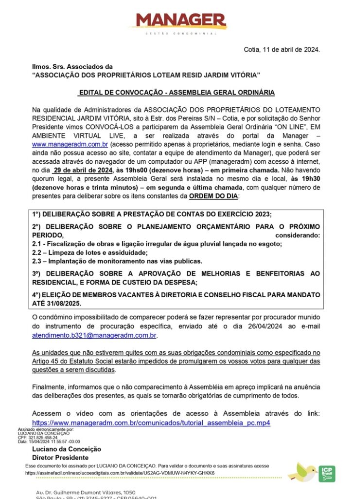 Edital de convocação – Assembleia Geral Ordinária – Residencial Jardim Vitória