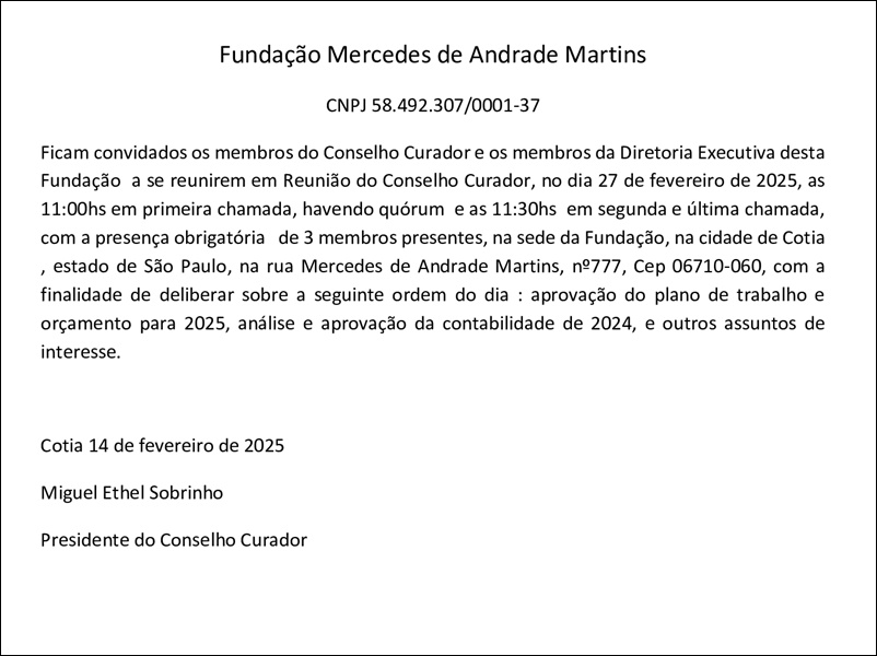EDITAIS Edital – Reunião do Conselho Curador – Fundação Mercedes de Andrade Martins 12/02/202512/02/2025 Editor