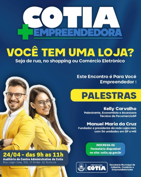 No dia 24 de abril, a Secretaria de Indústria, Comércio e Empreendedorismo, por meio do ‘Cotia +Empreendedora’, realizará palestras para quem trabalha com vendas.