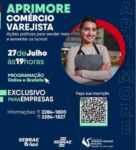 Atenção empreendedores de Vargem Grande Paulista, a Secretaria de Indústria, Comércio e Emprego está com uma parceria com o Sebrae Aqui, para quem deseja se aprimorar no comércio varejista.