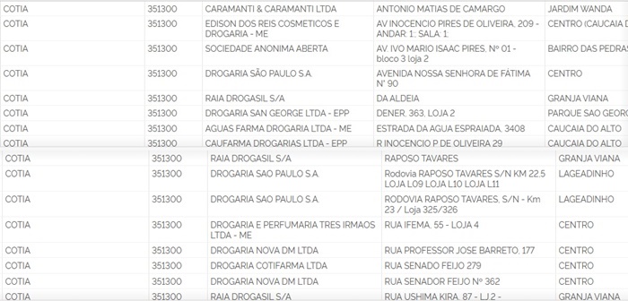 As farmácias credenciadas em Cotia são 15, conforme a lista abaixo: