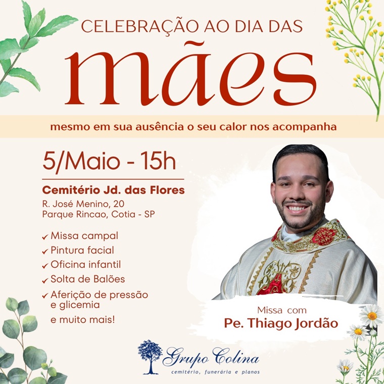 O Grupo Colina, empresa responsável pelo atendimento funerário da cidade de Cotia traz para todos os moradores uma abençoada missa campal, que será no dia 5 de maio, às 15h no Cemitério Jardim das Flores, no Km 30 da Raposo Tavares.