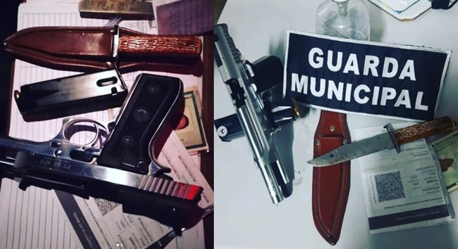 Na busca dentro do veículo, os guardas encontraram uma pistola 9mm no banco do passageiro, debaixo de uma mochila, além de uma faca. A arma não tinha registro e o falso policial confessou não ter porte.