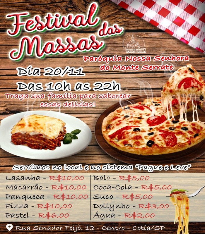 A Paróquia de Nossa Senhora do Monte Serrate promove o Festival de Massas, das 10h às 22h no salão ao lado da igreja. Confira mais detalhes abaixo: