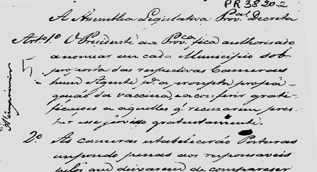 Em 1838, quando o Brasil ainda era Império, foi aprovada pela então Assembleia Legislativa Provincial a Lei 21, de 5 de março. A lei determinava que todas as cidades deveriam nomear agentes para aplicar vacinas e também previa penas aos cidadãos que não comparecessem para ser vacinados.