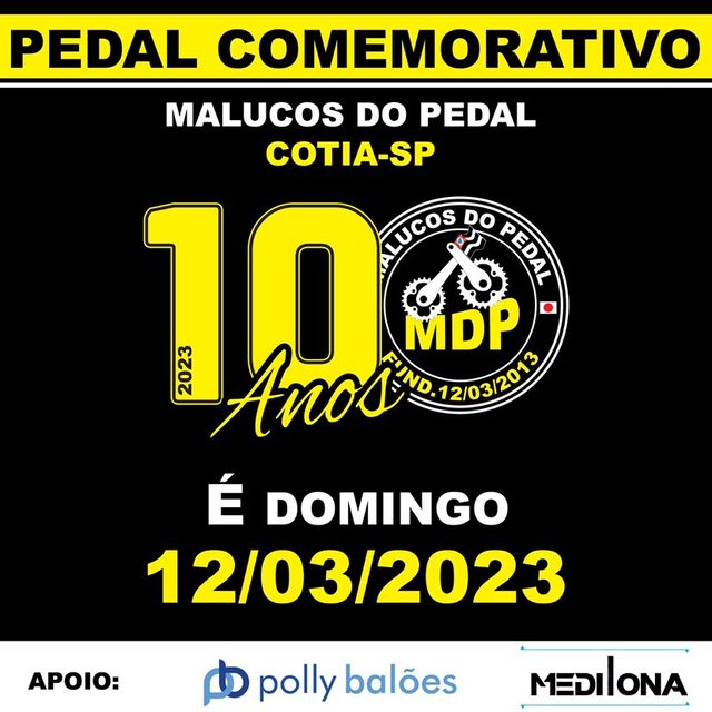 E os Malucos do Pedal, grupo de bikers de Cotia, celebram 10 anos de existência e, para isso, marcaram para este domingo uma pedalada comemorativa de 37km, com roteiro traçado por Cotia, Morro Grande, Estrada do DAE, Muro MDP e Embu das Artes.