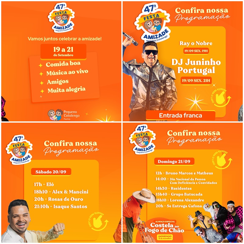 O Pequeno Cotolengo Paulista convida a todos para a 47ª edição da sua tradicional Festa da Amizade, que acontecerá nesta sexta (19), sábado (20) e domingo (21). Com o tema “O que nos une nos faz brilhar”, o evento deste ano ganha um significado ainda maior ao coincidir com o Dia Nacional da Pessoa com Deficiência, celebrado em 21 de setembro.