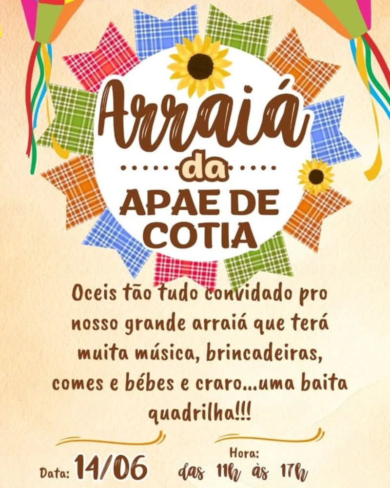 Acontece neste sábado (14) a tradicional Festa Junina da Apae de Cotia, uma festança para toda a família se divertir, comer muitas delícias e ainda contribuir com o projetos da instituição, que há mais de 30 anos atende crianças e jovens com deficiência intelectual em Cotia.
