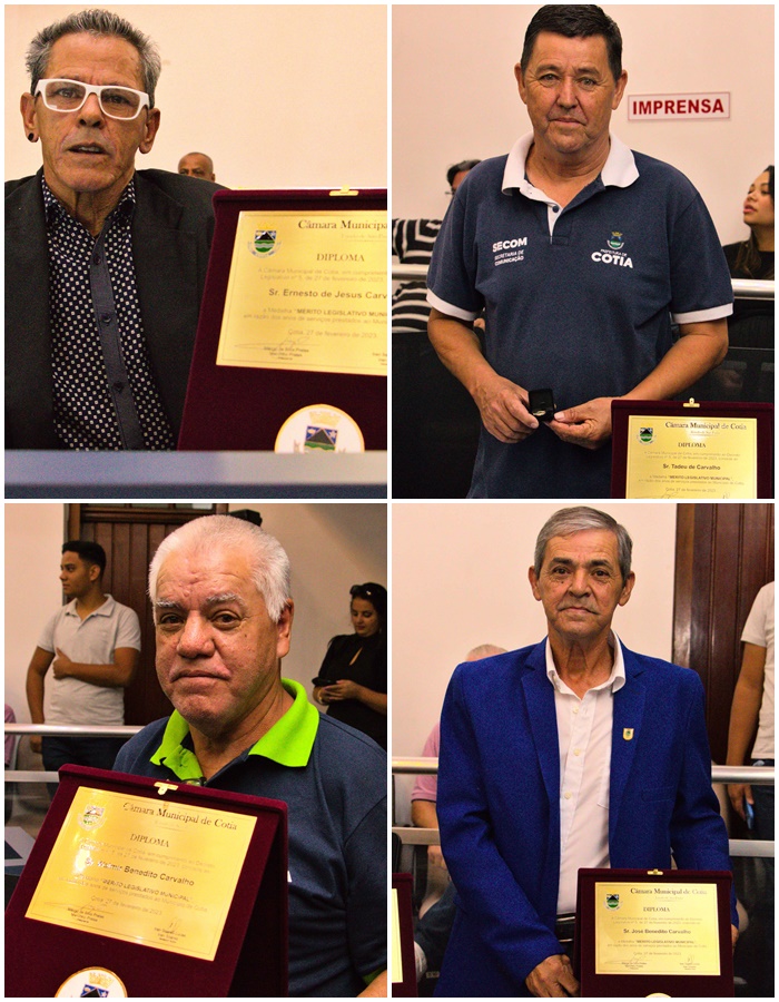 Quatro irmãos, quatro funcionários da Prefeitura de Cotia, quatro homenageados. Na manhã desta terça-feira (11), os colaboradores da Prefeitura: José Benedito Carvalho, o Bolachinha; Walmir Benedito Carvalho, o Bolacha; Tadeu de Carvalho e Ernesto de Jesus Carvalho, o Boy Brasil, receberam a Medalha ‘Mérito Legislativo Municipal’, na Câmara de Cotia. A honraria foi concedida por meio de Decreto Legislativo aprovado por unanimidade pelos vereadores. Os irmãos Carvalhos, conhecidos como ‘Bolachinhas’, estão entre os colaboradores mais antigos da administração pública municipal na ativa.