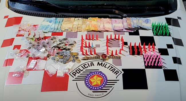 Foram realizadas buscas no local e, imediatamente, o criminoso foi localizado escondido na vegetação. Com ele foi localizada uma pochete contendo mais de 130 porções de crack, maconha e cocaína, embalados e fracionados para venda, além de dinheiro proveniente do comércio dos entorpecentes.