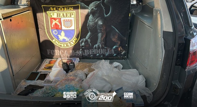 Na residência informada, equipes do 5º Baep – Batalhão de Ações Especiais de Polícia visualizaram um homem se desfazendo de cadernos com anotações relacionadas ao tráfico. Ao perceber os policiais, o bandido desobedeceu a ordem de parada e retornou para dentro da residência, sendo seguido pela equipe.