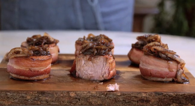 Enrolar uma fatia de bacon, prender com auxílio de um palito e temperar com sal e pimenta. Aquecer uma frigideira, regar com o azeite e selar os medalhões 3 minutos de cada lado. Com auxílio de uma pinça, virar o medalhão e dourar o bacon de sua lateral.