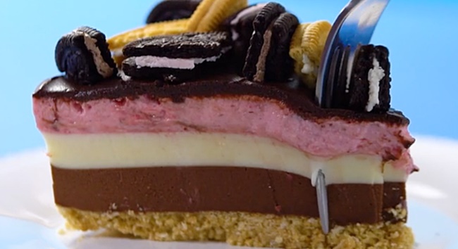 Para o mousse de chocolate branco, repetir a mesma operação do chocolate meio amargo.Quando estiver pronto, dispor sobre a camada de chocolate e voltar a geladeira por mais 20 minutos.Bater o creme de leite fresco com o recheio de Oreo morango. Reservar.