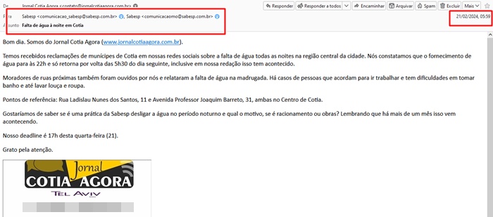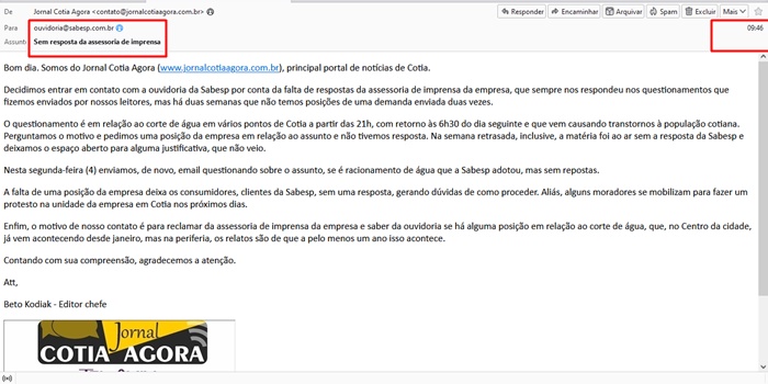 Uma falta de respeito com o trabalho da imprensa e, principalmente com os moradores de Cotia. Aliás, um grupo se mobiliza e deve fazer protestos em frente à Sabesp em Cotia.