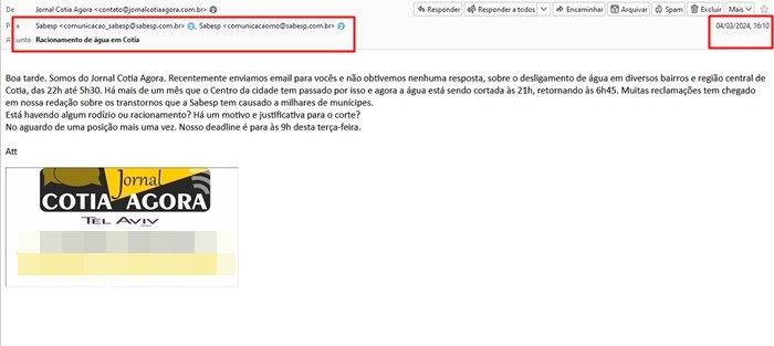 Para piorar, a Sabesp faz vista grossa e não dá uma resposta a seus clientes, que pagam as contas mensalmente, sobre a falta de água. O Jornal Cotia Agora enviou três emails, sendo dois para a assessoria de imprensa (em 21/2 e 4/3) e para a ouvidoria (5/3) e nenhum contato foi feito da empresa com nossa redação.