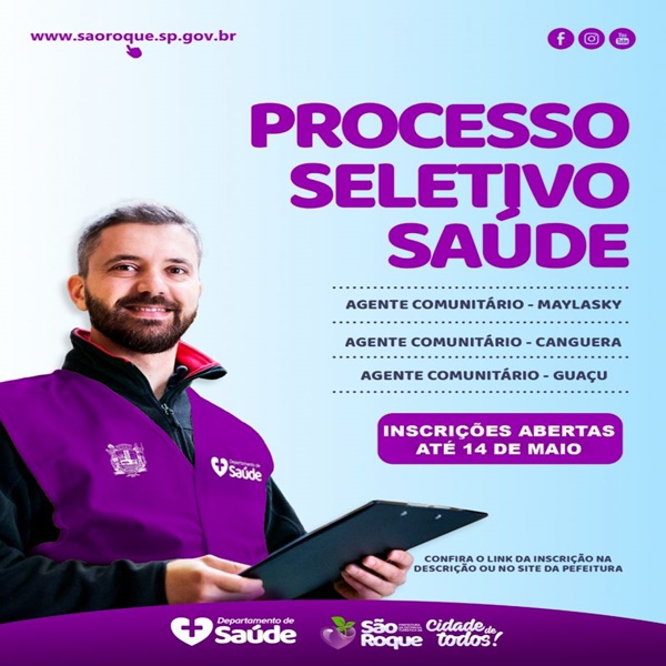 A Prefeitura de São Roque abriu inscrições para o Processo Seletivo na área da saúde, desta vez para vaga de Agente Comunitário de Saúde para atuar nos bairros do Guaçú, Maylasky e Canguera. As inscrições vão até o dia 14 de maio e são gratuitas.