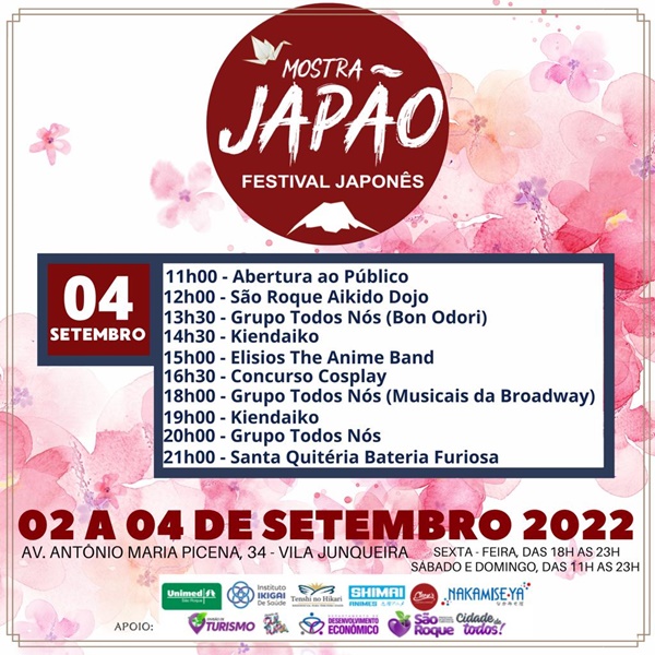 São Roque será palco do festival japonês “Mostra Japão” nesta semana. O evento ocorre nos dias 2, 3 e 4 de setembro, no Recanto da Cascata, sexta – feira das 18h as 23h, sábado e domingo das 11h as 23h, com entrada gratuita, onde basta doar 1kg de alimento não perecível.