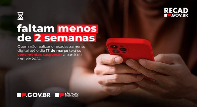 Servidores públicos ativos do Estado de São Paulo têm menos de duas semanas para realizar o recadastramento digital obrigatório pelo aplicativo SOU.SP.GOV.BR. Quem não realizar o procedimento até o dia 17 de março ficará sem receber os vencimentos a partir de abril, pois não haverá prorrogação do prazo.