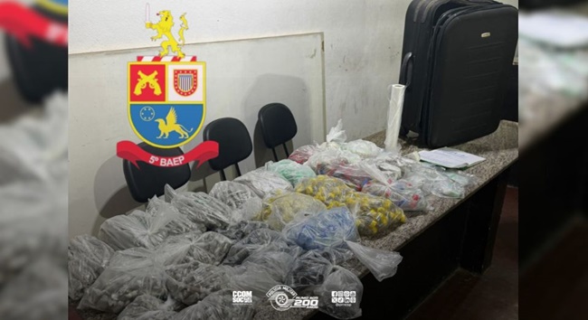 Na abordagem pessoal nada de ilícito foi encontrado. No entanto, durante buscas no interior da casa, os policiais localizaram uma mala contendo 2.043 porções de maconha, além de um caderno com anotações relacionadas à contabilidade do tráfico de drogas.