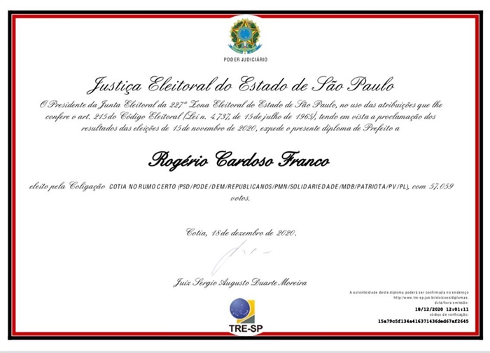 TRE-SP diploma Rogério Franco como prefeito de Cotia