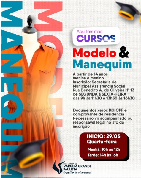 A Secretaria Municipal de Assistência Social de Vargem Grande Paulista está com inscrições abertas para o curso de modelo e manequim. Se você tem 14 anos ou mais, de ambos os sexos, essa é a sua chance de se destacar no mundo da moda.