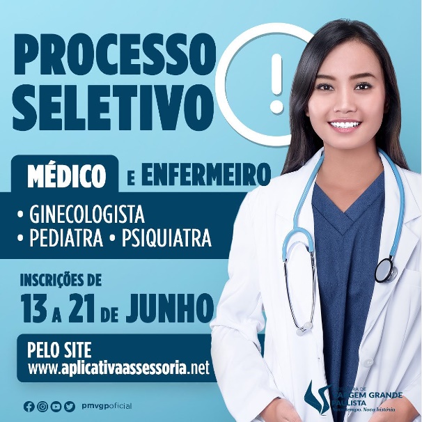 A Prefeitura de Vargem Grande Paulista está com inscrições abertas de 13 a 21 de junho, para o Processo Seletivo visando a contratação de enfermeiros e médicos (ginecologista, pediatra e psiquiatra). Os interessados deverão se inscrever pelo site www.aplicativaassessoria.net