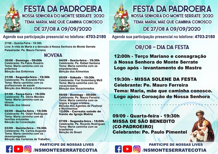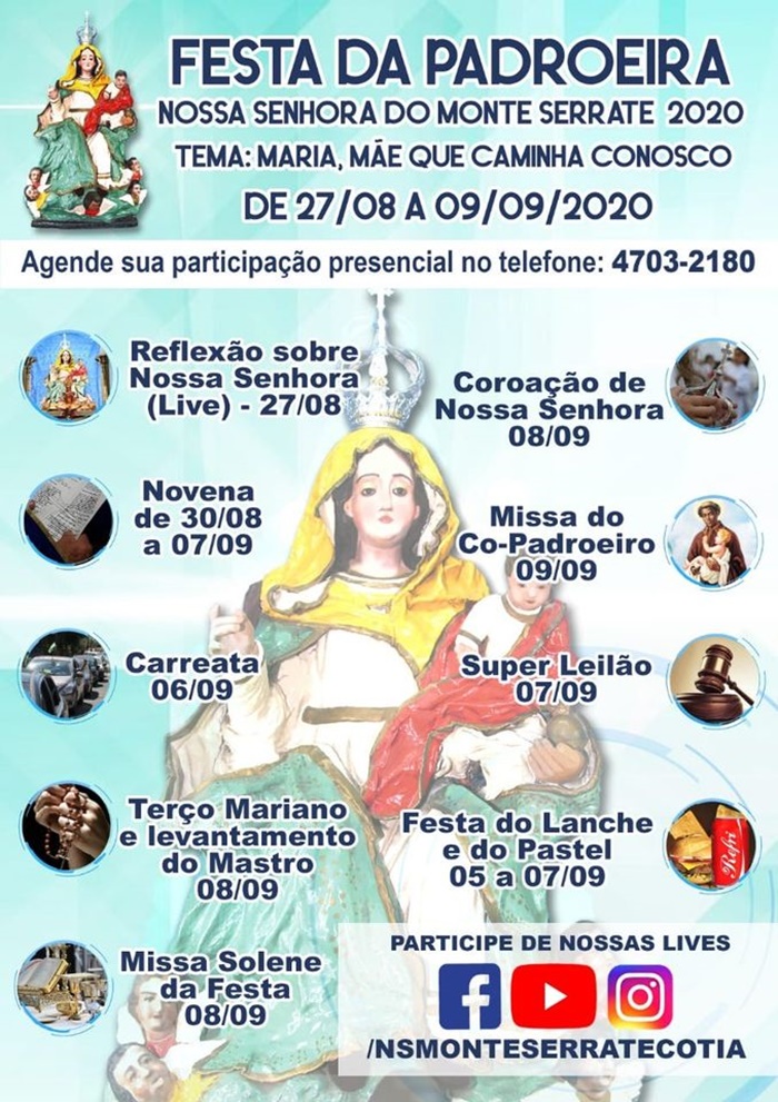 Devido ao coronavírus a festa religiosa mais tradicional de Cotia este ano será de forma diferente. As festividades de Nossa Senhora do Monte Serrate e os 307 anos da Paróquia terão programação presencial e online, principalmente nas celebrações religiosas.