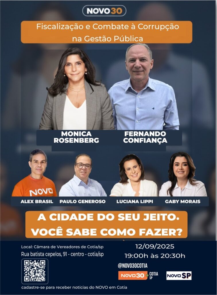 Em um movimento para impulsionar a participação cidadã na administração pública, o partido NOVO em Cotia promoverá um evento aberto à comunidade no dia 12 de setembro. A palestra, com o tema “A Cidade do seu Jeito. Você sabe como fazer?”, reunirá profissionais de alto calibre para debater os desafios da fiscalização e do combate à corrupção.